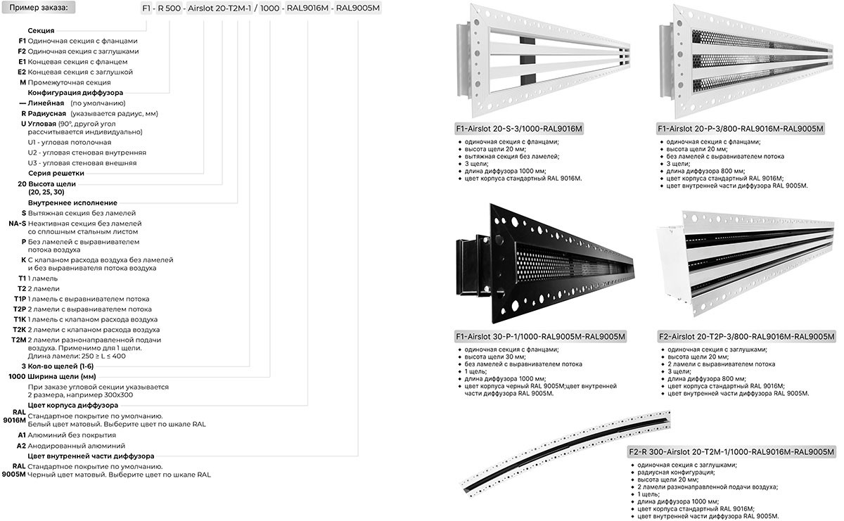 Щелевые решетки Airslot изготавливаются из экструдированного алюминиевого профиля АД31 по ГОСТ 22233-2001. По умолчанию корпус диффузоров окрашивается в стандартный белый цвет RAL 9016 матовый, а внутренняя перфорированная кассета и ламели в чёрный цвет RAL9005 матовый. По индивидуальному заказу возможна окраска в любой цвет по шкале RAL как корпуса, так и внутренней части.
