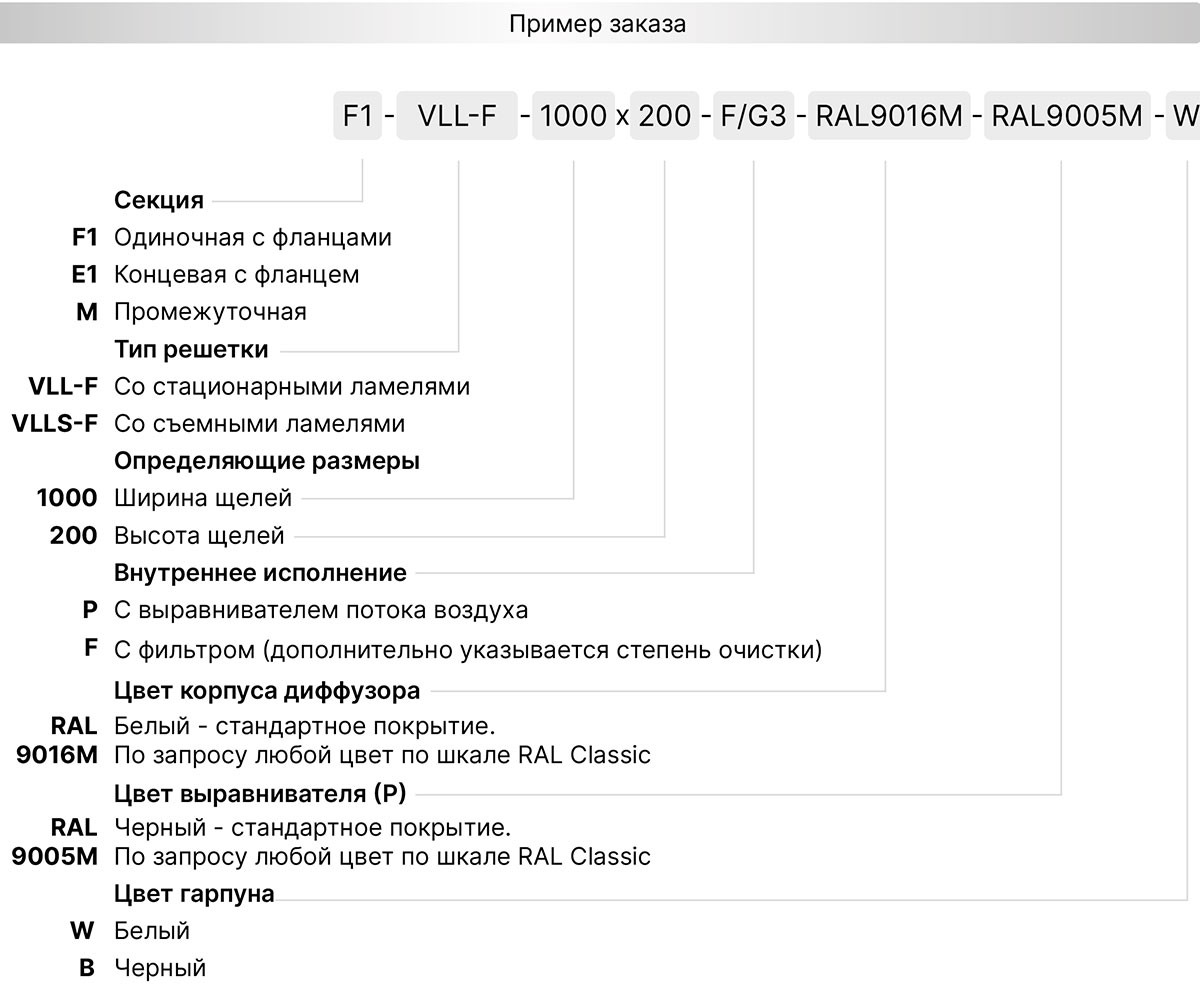 Используемые материалы. Щелевые решетки VLL-F и VLLS-F изготавливаются из экструдированного алюминиевого профиля АД31 по ГОСТ 22233-2018. По умолчанию корпус решетки окрашивается в стандартный белый цвет RAL 9016М матовый, а внутреннее исполнение в чёрный цвет RAL9005М матовый. По индивидуальному заказу возможна окраска в любой цвет по шкале RAL. Статическая камера изготавливается из оцинкованной листовой стали 0,4 - 1,5 мм в зависимости от размера и пожелания заказчика. По умолчанию все изделия поставляются в неокрашенном виде.